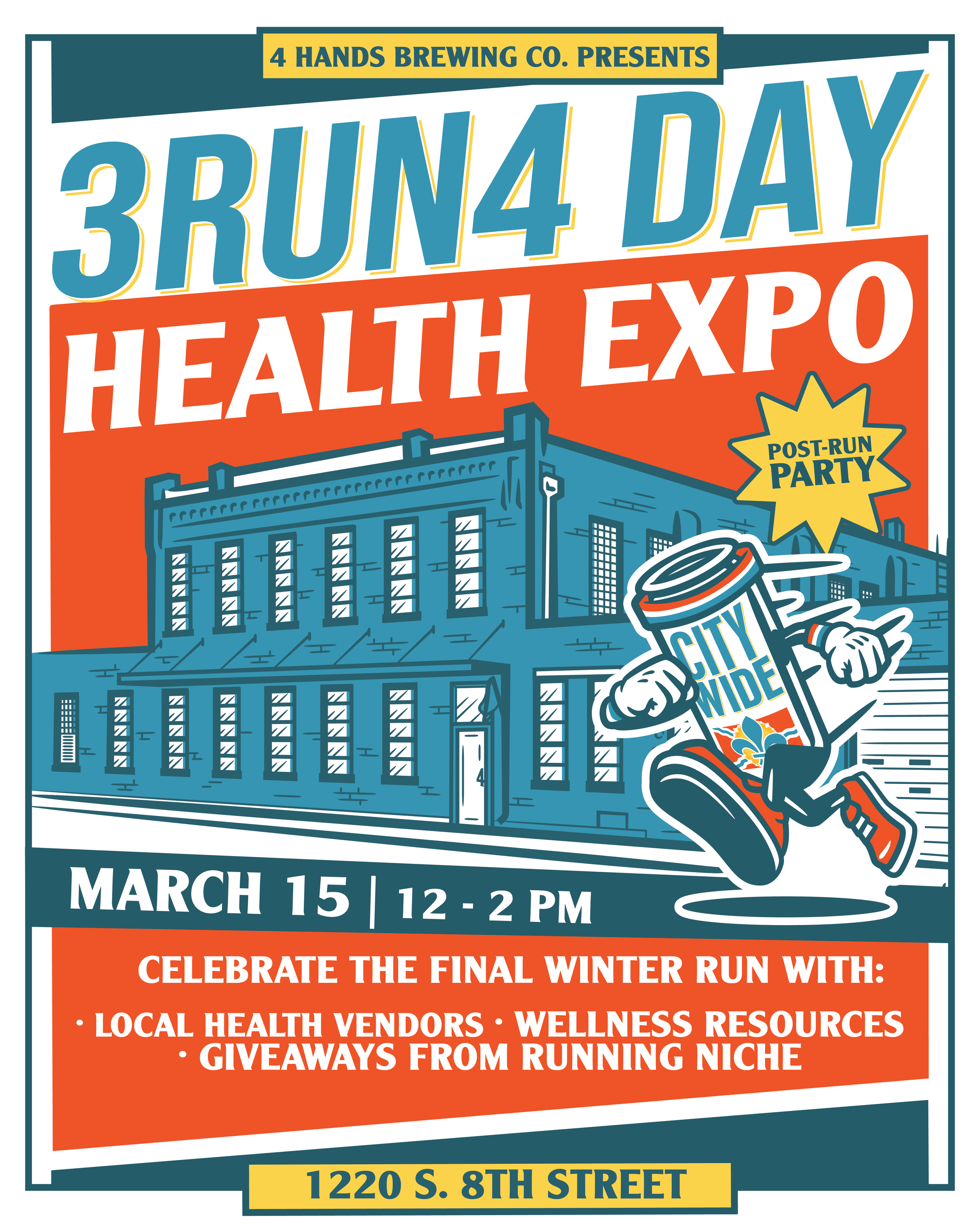 Join 4 Hands Brewing Co. and 3Run4 running group on Sunday, March 15 for an easy 2- or 3- mile run/walk followed by a post-run health and wellness expo featuring running shoe brands, local races, fitness studios, and community partners. The group run will start at 11:45am, and the expo will kick off at 12pm.